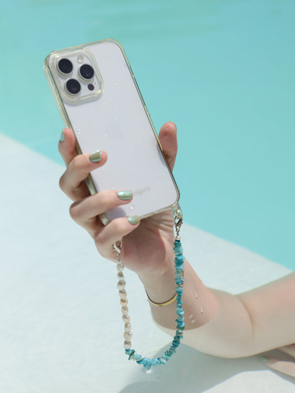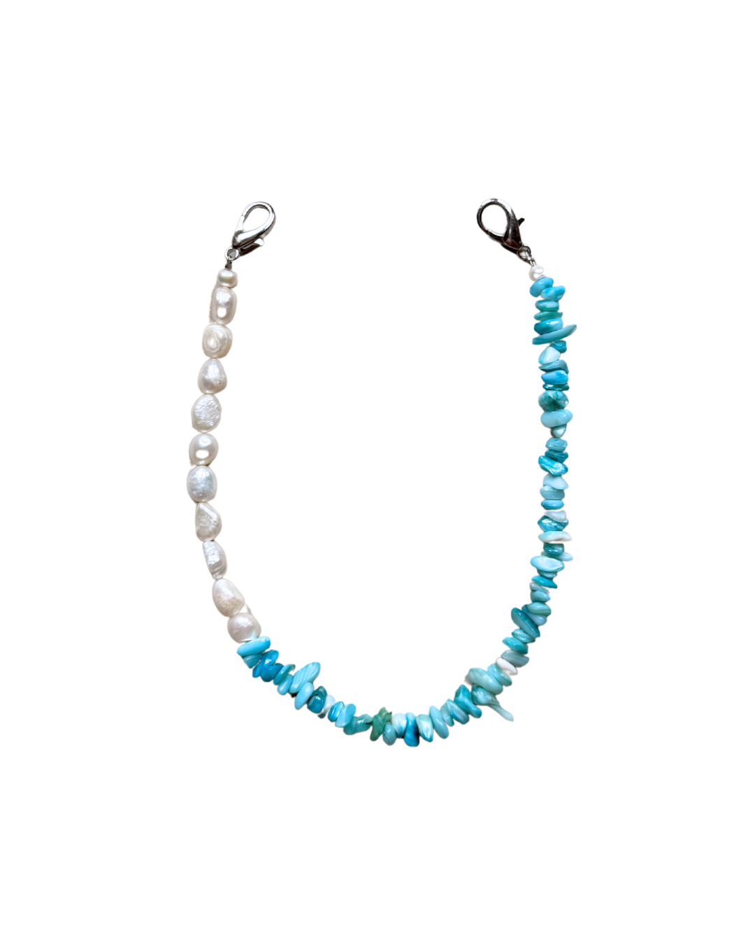 The perfect blue doesn't exi- oh yes it does! Our Santai phone strap is made of a turquoise blue coral mixed with real freshwater pearls from Lombok.